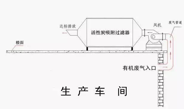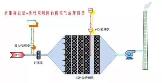 車間有機廢氣通過吸氣罩收集,在排風機作用下,經(jīng)過管道輸送進入干式過濾器,再進入活性炭吸附裝置,有機污染物被活性炭吸附,凈化后的氣體經(jīng)風機增壓后達標排放。活性炭吸附飽和后,請專業(yè)廠家再生后回用。